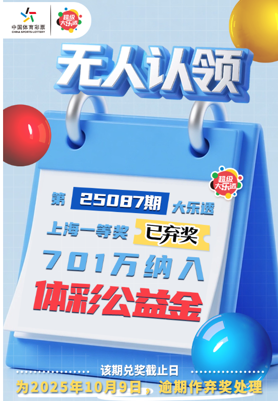 截至10月9日24:00,超级大乐透第25087期上海一等奖得主未到兑奖处兑奖,当期所中701万余元奖金逾期无人领取,将纳入体彩公益金。