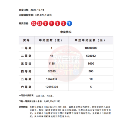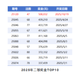 北京时间2025年10月19日,福彩双色球第25120期开奖,本期头奖仅开出1注1000万,二等奖开出47注50.8万。值得注意的是,50.8万是2025年至今开出的最高二等奖奖金,而47注是今年二等注数最少的一期开奖。