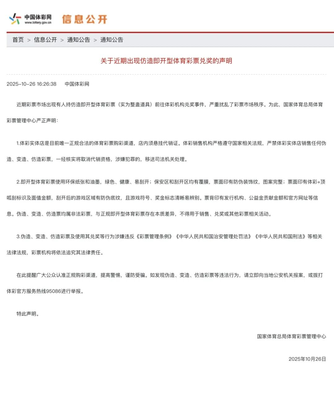 10月28日,央视《朝闻天下》栏目报道了一则关乎每位购彩者切身利益的重要新闻——国家体彩中心正式发布了《关于近期出现仿造即开型体育彩票兑奖的声明》,揭示了近期彩票市场上有不法分子利用仿造的即开型体育彩票(实为整蛊道具)试图在体彩机构进行兑奖。此举不仅严重扰乱了正常的彩票市场秩序,也对广大购彩者的权益构成了潜在威胁。