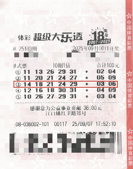 9月20日,超级大乐透第25108期开奖。前区开出号码14、18、21、24、29;后区开出号码03、06。本期全国销售3.41亿元,为国家筹集彩票公益金1.22亿元。其中,广东肇庆中得1注基本投注一等奖,出自肇庆市封开县江口镇红卫路16号4408036002体彩实体店。