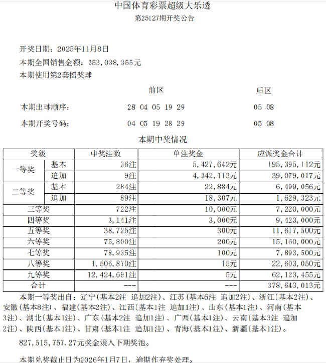本期36注头奖分落全国16地,分别来自辽宁(基本2注 追加2注)、江苏(基本6注 追加2注)、浙江(基本2注)、安徽(基本8注)、福建(基本2注)、江西(基本1注 追加1注)、山东(基本1注)、河南(基本3注)、湖北(基本1注)、广东(基本2注 追加1注)、广西(基本1注)、云南(基本3注 追加2注)、陕西(基本1注)、甘肃(基本1注 追加1注)、青海(基本1注)、新疆(基本1注)。二等奖开出284注,单注奖金2.2万余元,其中89注采用追加投注,每注多得奖金1.8万余元。本期全国销量为3.53亿元,奖池方面,8.27亿余元滚存至11月10日(周一)开奖的第25128期。
