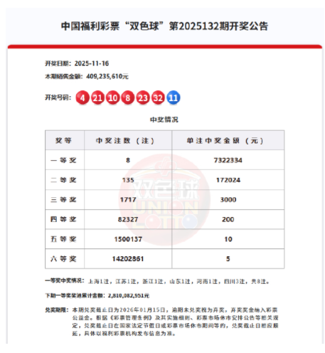 北京时间2025年11月16日,福彩双色球第25132期开奖,以下是详细开奖流程: