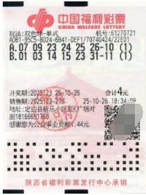 据了解,这张中奖彩票于10月26日下午18点34分在定边县新乐小区B区广场对面的福彩第61270721号投注站售出,票面上仅包含2注单式号码。正是其中第一注号码,准确命中了全部的开奖号码,获得了一等奖。