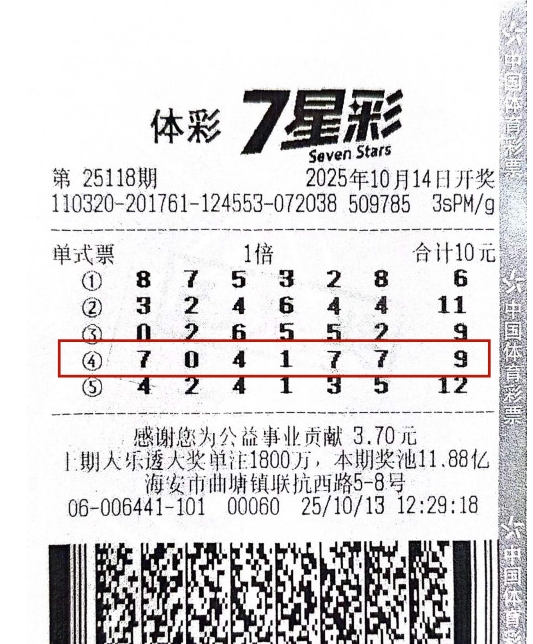 南通购彩者随机投注领走7星彩二等奖