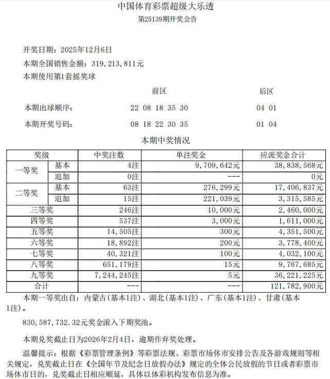 北京时间12月6日晚,体彩大乐透第25139期开奖,当期开奖号码为前区08 18 22 30 35,后区01 04。