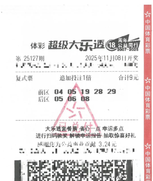 11月8日,超级大乐透第25127期开奖。前区开出号码04、05、19、28、29;后区开出号码05、08。其中,佛山中得1注追加投注一等奖,出自顺德区北滘镇三洪奇市场1号铺4422022280体彩实体店。中奖购彩者通过中出1注(含追加)一等奖9,769,755元,二注二等奖(含追加)82,382元。单票揽获奖金9,852,137元,贡献税收1,970,427.4元。