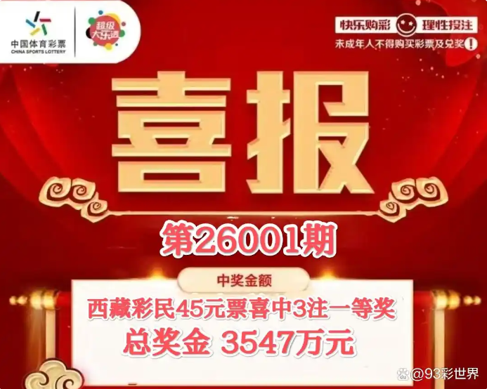 2026年1月3日,一位来自西藏的彩民就成功实现了大奖梦,并且还是一人独中3注一等奖,揽获3547万元奖金,成为本年度当之无愧的“天选之人”。
