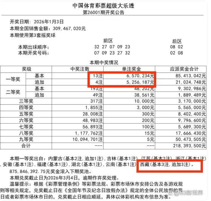 据体彩官网开奖公告显示,这注3547万元大奖出自于今年的首期开奖(第26001期),当期开出号码:07、09、23、27、32+02、08,一等奖中出13注,单注奖金657万元。
