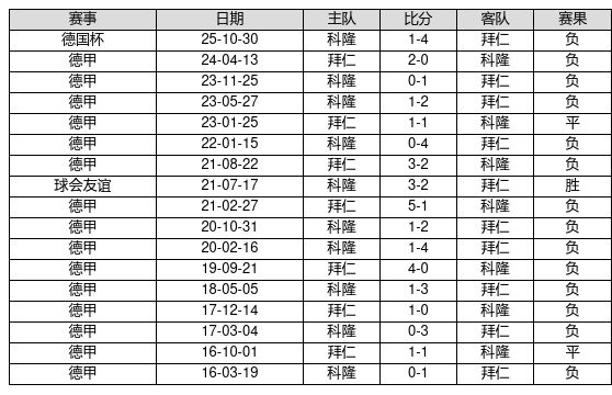 科隆 VS 拜仁两队近10年的交战次数为17场,科隆1胜2平14负,赢球概率为5.9%,平局概率为11.8%,输球概率为82.4%。