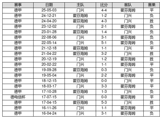 霍芬海姆 VS 门兴两队近10年的交战次数为20场,霍芬海姆4胜8平8负,赢球概率为20.0%,平局概率为40.0%,输球概率为40.0%。
