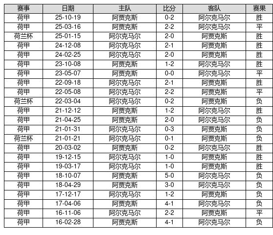 阿尔克马尔 VS 阿贾克斯两队近10年的交战次数为23场,阿尔克马尔10胜4平9负,赢球概率为43.5%,平局概率为17.4%,输球概率为39.1%。