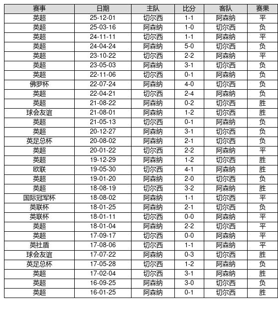 切尔西 VS 阿森纳两队近10年的交战次数为30场,切尔西8胜9平13负,赢球概率为26.7%,平局概率为30.0%,输球概率为43.3%。
