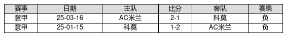 科莫 VS AC米兰两队近10年的交战次数为2场,科莫0胜0平2负,赢球概率为0.0%,平局概率为0.0%,输球概率为100.0%。