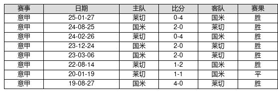 国米 VS 莱切两队近10年的交战次数为8场,国米7胜1平0负,赢球概率为87.5%,平局概率为12.5%,输球概率为0.0%。