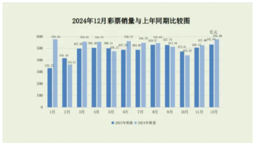 1-12月累计,全国共销售彩票6234.86亿元,同比增加437.90亿元,增长7.6%。其中,福利彩票机构销售2079.56亿元,同比增加135.15亿元,增长7.0%;体育彩票机构销售4155.30亿元,同比增加302.75亿元,增长7.9%。