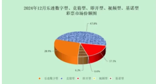 12月份,乐透数字型、竞猜型、即开型、基诺型彩票销售量分别占彩票销售总量的28.9%、47.8%、17.1%、6.2%。视频型彩票销售0.0012亿元,同比减少0.0002亿元。