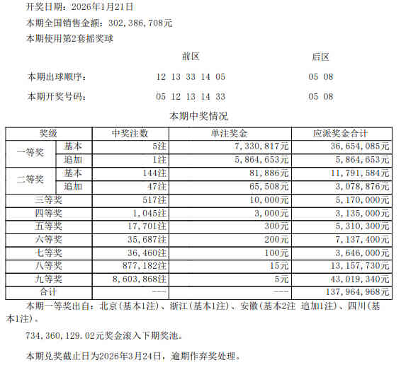 北京时间1月21日晚,体彩大乐透第26009期开奖,当期开奖号码为前区05 12 13 14 33,后区05 08。