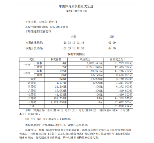 北京时间1月24日晚,体彩大乐透第26010期开奖,当期开奖号码为前区02 03 13 18 26,后区02 09。