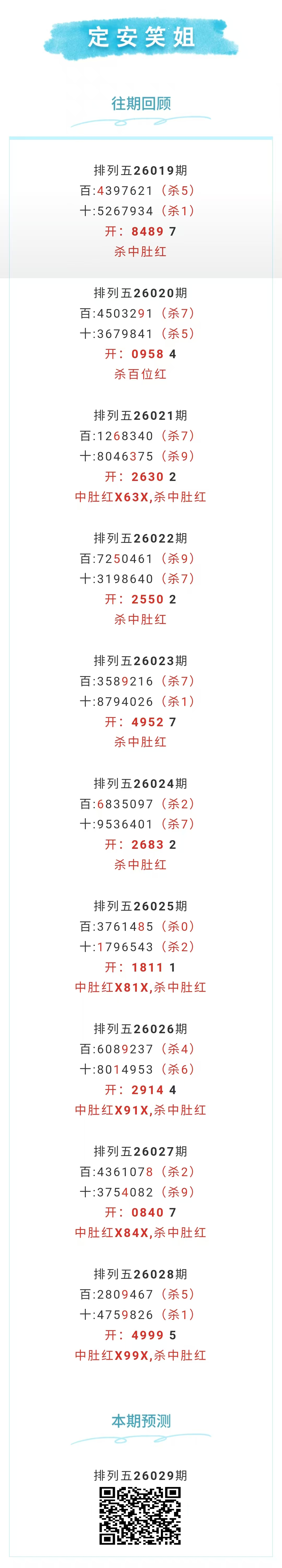 【排列五-26029期】杀中肚8连红,本月圈红14次中肚,中肚近10红5;上期中肚红X99X 发表于:2026-01-29 11:41:50 浏览次数:300 上一篇: 下一篇:没有了 【春哥打奖】 范围码14红11 更新中 【天意人生】 范围码14红9 更新中 【彩女】 范围码14红9 更新中 排列五杀码荣誉榜