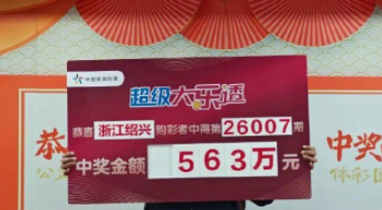 1月17日,体彩大乐透26007期开奖,全国共中出18注一等奖,其中一注落在浙江省绍兴市,单票奖金高达563万元。中奖者胡先生(化姓)于1月19日来到浙江省体育彩票管理中心领取了这笔大奖。