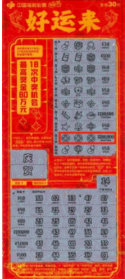 在众多福彩游戏中,“刮刮乐”即开票以即买即刮、即中即兑、玩法多样、趣味十足而深受购彩者喜爱。春节期间,“好运来”更是与新年美好寓意契合,成为传递祝福的热门选择。该款游戏票面采用经典红金配色:红色喜庆热烈,烘托浓浓年味;金色富贵吉祥,寓意财源广进;票面融入锦鲤、福袋等传统吉祥元素,整体设计紧扣“好运”主题,贴合春节氛围。