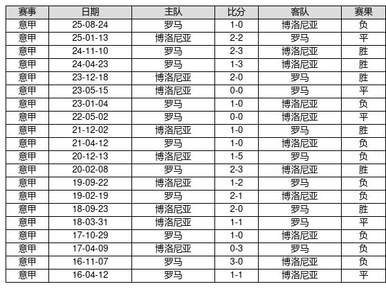 博洛尼亚 VS 罗马两队近10年的交战次数为20场,博洛尼亚6胜5平9负,赢球概率为30.0%,平局概率为25.0%,输球概率为45.0%。