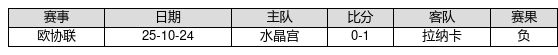 水晶宫 VS 拉纳卡两队近10年的交战次数为1场,水晶宫0胜0平1负,赢球概率为0.0%,平局概率为0.0%,输球概率为100.0%。