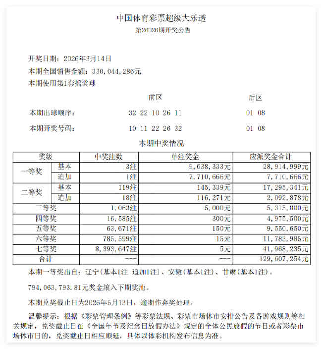 体彩开奖直播截图北京时间3月14日晚,体彩大乐透第26026期开奖,当期开奖号码为前区10 11 22 26 32,后区01 08。