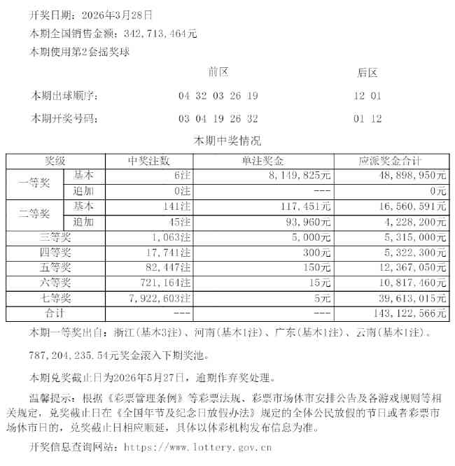 北京时间3月28日晚,体彩大乐透第26032期开奖,当期开奖号码为前区03 04 19 26 32,后区01 12。
