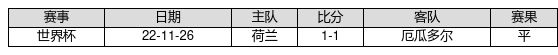 荷兰 VS 厄瓜多尔两队近10年的交战次数为1场,荷兰0胜1平0负,赢球概率为0.0%,平局概率为100.0%,输球概率为0.0%。