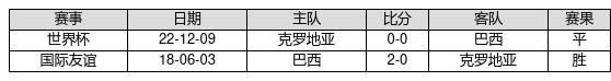巴西 VS 克罗地亚两队近10年的交战次数为2场,巴西1胜1平0负,赢球概率为50.0%,平局概率为50.0%,输球概率为0.0%。
