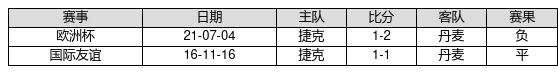 捷克 VS 丹麦两队近10年的交战次数为2场,捷克0胜1平1负,赢球概率为0.0%,平局概率为50.0%,输球概率为50.0%。