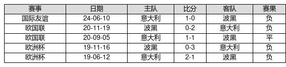 波黑 VS 意大利两队近10年的交战次数为5场,波黑0胜1平4负,赢球概率为0.0%,平局概率为20.0%,输球概率为80.0%。