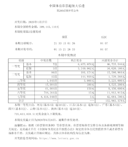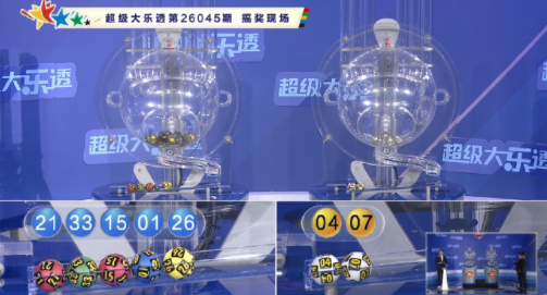 北京时间4月27日晚,体彩大乐透第26045期开奖,当期开奖号码为前区01 15 21 26 33,后区04 07。