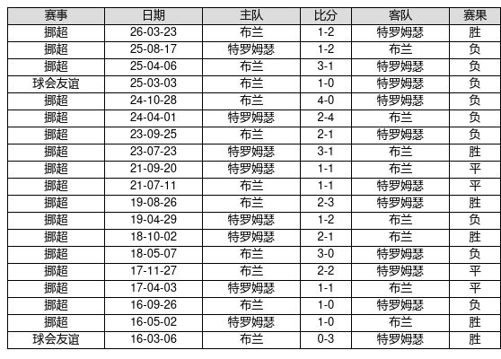 特罗姆瑟 VS 布兰两队近10年的交战次数为19场,特罗姆瑟6胜4平9负,赢球概率为31.6%,平局概率为21.1%,输球概率为47.4%。