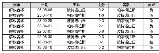 波特诺山丘 VS 帕尔梅拉斯两队近10年的交战次数为8场,波特诺山丘1胜0平7负,赢球概率为12.5%,平局概率为0.0%,输球概率为87.5%。