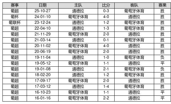 葡萄牙体育 VS 通德拉两队近10年的交战次数为16场,葡萄牙体育11胜3平2负,赢球概率为68.8%,平局概率为18.8%,输球概率为12.5%。