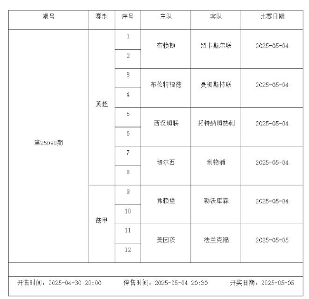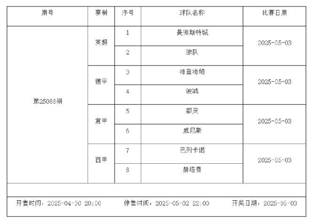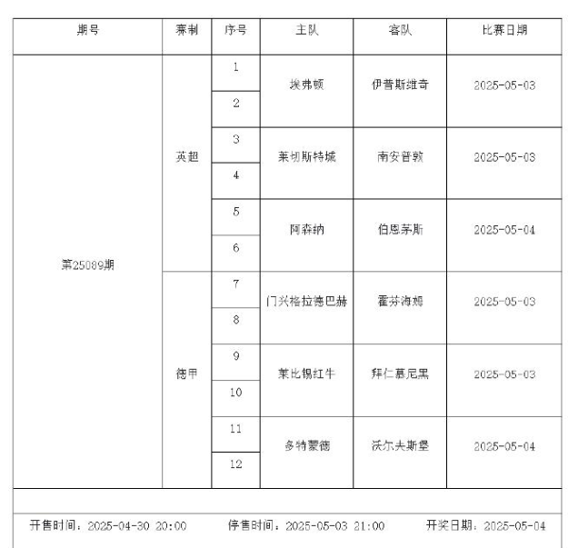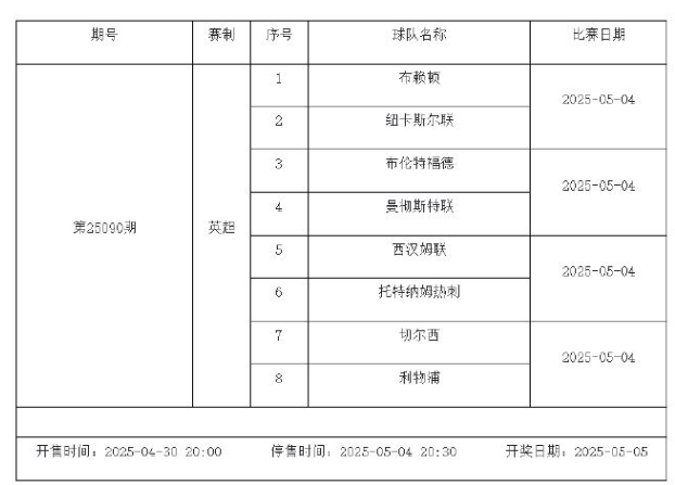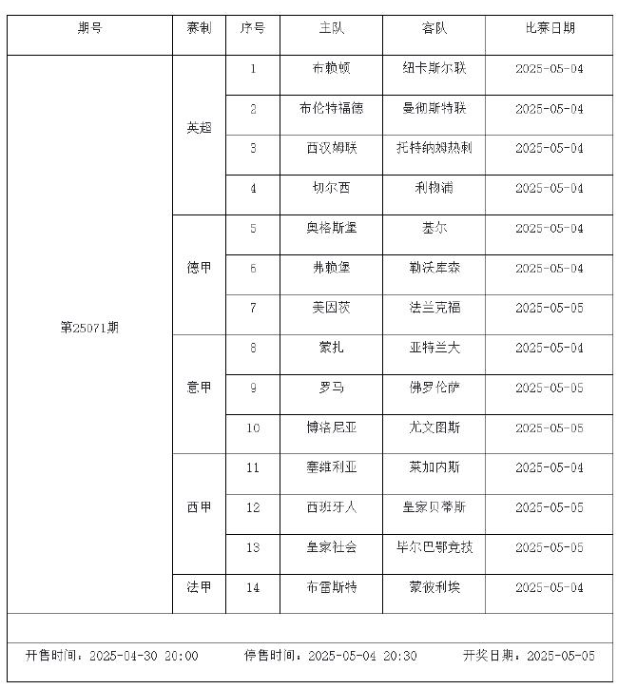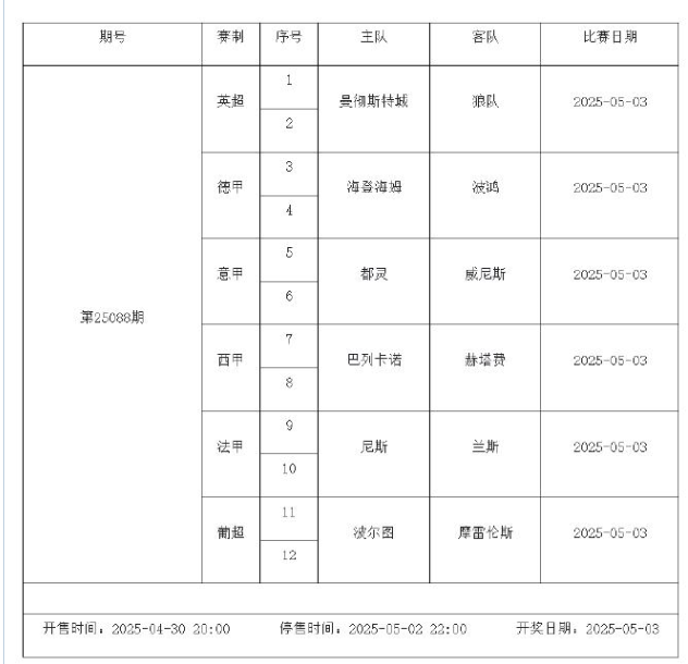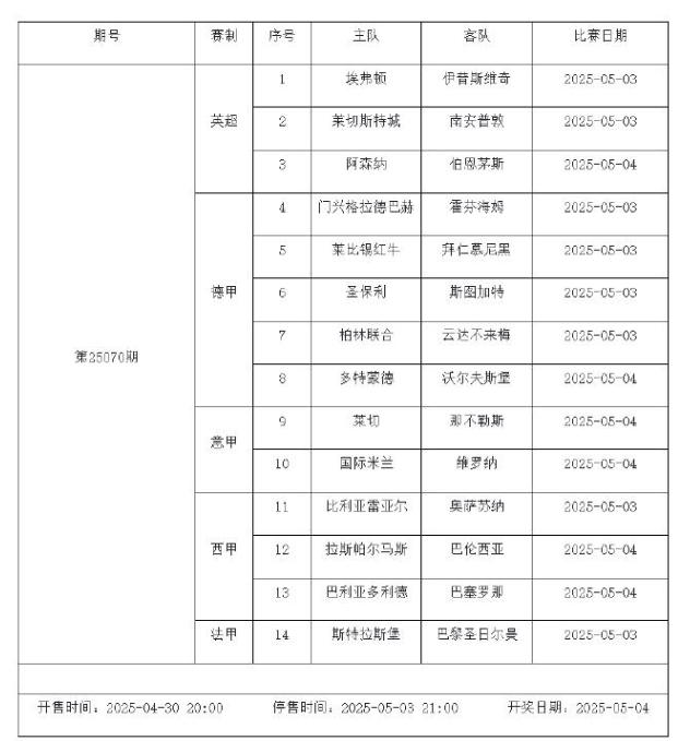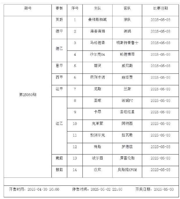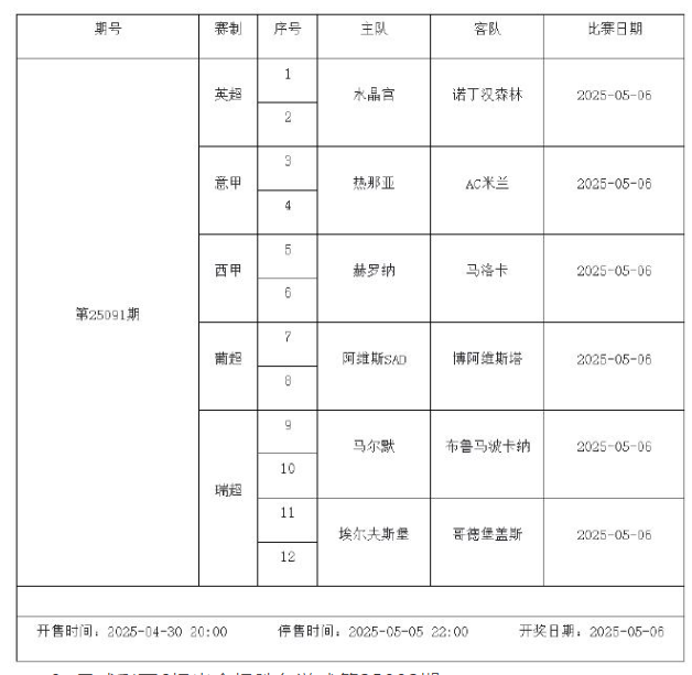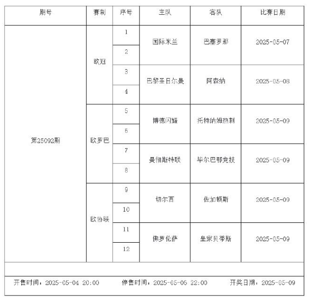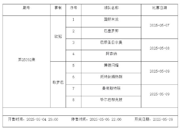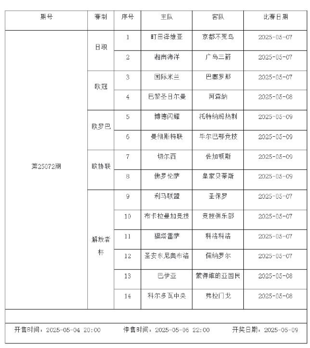 我中心制定了2025年中国足球彩票胜负游戏(14场、任选9场)、6场半全场胜负游戏和4场进球游戏5月2日-5月8日的竞猜场次安排(具体附后),其竞猜对象、开售时间、停售时间和计奖时间均以本文为准。