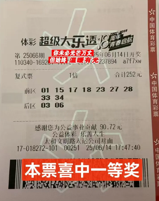 6月14日晚,体彩超级大乐透第25066期的开奖中,安徽省唯一的一注1000万元一等奖,来自阜阳市太和县!