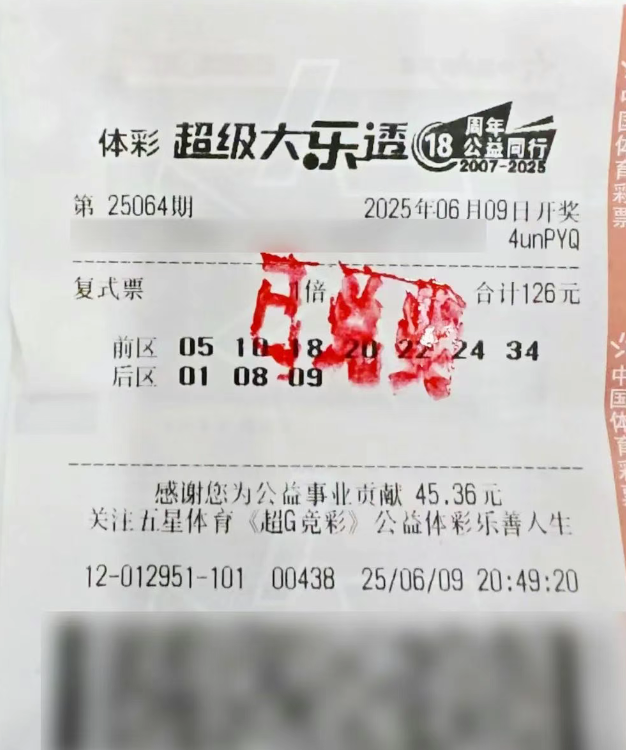 6月9日,超级大乐透第25064期开奖。前区号码为05、10、18、20、34,后区号码为01、08。当期全国销售总金额达到3.28亿元,为国家筹集彩票公益金1.18亿元。