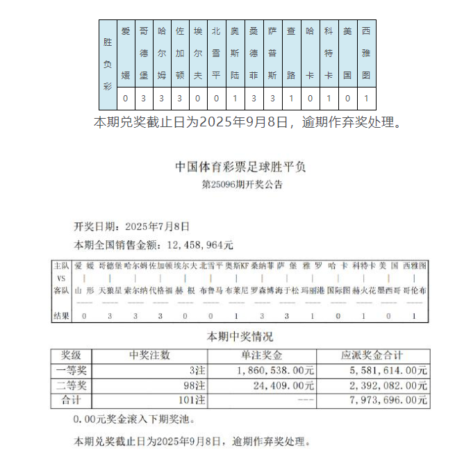 北京时间7月8日,足彩第25096期开奖结果揭晓。14场胜负彩一等奖开出3注,每注奖金超过186万元;14场二等奖开出98注,每注奖金24409元;任九奖开出483注,每注奖金14358元。本期胜负彩的总销量为12,458,964元,任九投注总额为10,836,470元。