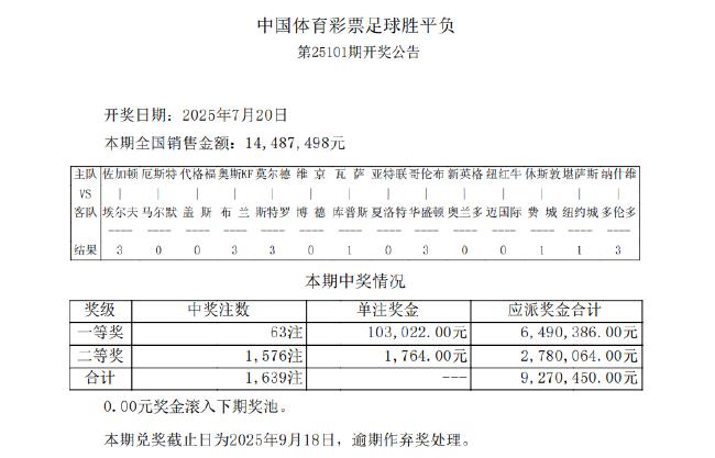 北京时间7月20日,胜负彩第25101期开奖结果揭晓。本期头奖开出63注,单注奖金103,022元;二等奖开出1,576注,单注奖金1,764元;任九开出14,741注569元。本期足彩销量为14,487,498元,任九投注总额为13,112,640元。
