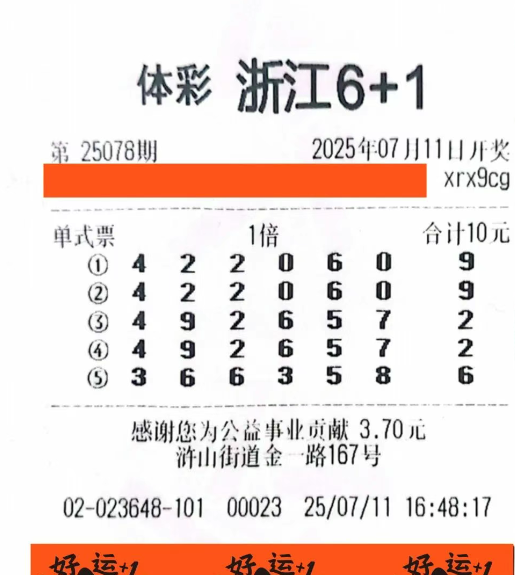 7月11日,浙江体彩“6+1”第25078期开奖,开奖号码为:4、9、2、6、5、7+2。本期中出了2注特等奖,每注奖金为500万元。幸运的中奖者均来自宁波慈溪市浒山街道金一路167号的体彩实体店,这张10元5注单式票揽获了1000万元的大奖。7月14日,中奖者朱女士(化姓)与家人一同前往浙江省体育彩票管理中心领取了大奖。