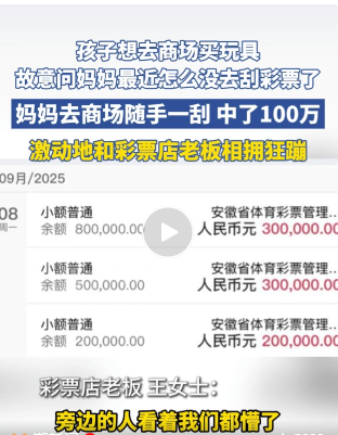 近日,安徽芜湖,一位宝妈在孩子的催促下顺道逛商场,买了一张刮刮乐,结果意外中得100万元大奖。她与彩票店老板激动地尖叫并紧紧相拥庆祝。店主王女士回忆道,这位宝妈当天大约刮了五六张彩票,已经中得了20元、30元和50元的小奖,但她并没有停手,继续刮,最终刮出了100万元大奖。王女士还透露,店里曾经售出过一张50元面值的百万大奖,这次则是20元面值的彩票中奖。领奖后,王女士兴奋地与记者分享:“孩子问她‘怎么最近没去刮彩票了’,其实是孩子想买玩具。那时我们数着零,简直不敢相信,旁边的人都被惊呆了。”