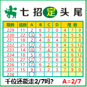 “七招定头尾”第3238期推荐版局规律,本期主攻27千位走第五步.
