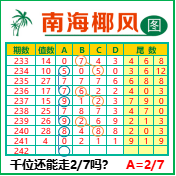 “南海椰风”第3242期推荐版局规律,本期千位27走三步.