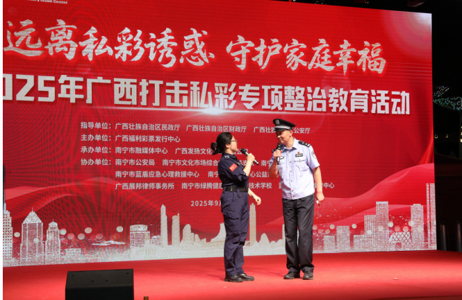 为进一步严厉打击私彩违法犯罪行为,净化社会环境,推动公益事业健康发展,提升公众自觉抵制非法彩票的意识和能力,由广西壮族自治区民政厅、财政厅、公安厅联合指导,广西福利彩票发行中心主办,南宁市公安局治安支队协办的“远离私彩诱惑 守护家庭幸福——2025年广西打击私彩专项整治教育活动”启动仪式,于9月13日在南宁会展航洋城举行。此次活动的举行,标志着广西在巩固历年打击非法彩票成果基础上,进一步扩大了整治行动的覆盖面和影响力,旨在构建全民共同抵制私彩的坚固防线。