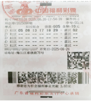 8月26日,中国福利彩票双色球第2025098期开奖,红色球号码为05、08、13、17、18、29,蓝色球为02,全国共中出22注一等奖,其中广东省梅州市梅江区泰康路78号的44070126福彩销售站中得5注一等奖。中奖者购买了一张10元、5倍投注的单式票,最终收获了超过2755万元的大奖。