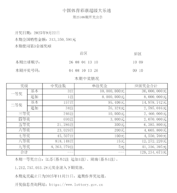 当期全国总销量为3.13亿元,奖池累计至12.12亿元,滚存至9月24日(周三)举行的第25110期。