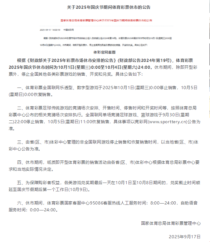 根据《财政部关于2025年彩票市场休市安排的公告》(财政部公告2024年第19号),福利彩票2025年国庆节休市时间为10月1日(星期三)0:00至10月4日(星期六)24:00。休市期间,除即开型彩票外,停止全国其他各类彩票游戏的销售、开奖和兑奖。具体公告如下:
